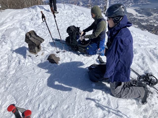 シールオフして山頂からパウダーに飛び込む。奇声をあげて雪を楽しみ、登りトレースに行き当たって終了。当然おかわり笑。また同じ登りトレースを使い、山頂へ登る。